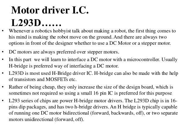 - 7. Motor driver I.C. L293D…… • Whenever a robotics hobbyist talk about making a robot, the first thing comes to his mind is making the robot move on the ground. And there are always two options in front of the designer whether to use a DC Motor or a stepper motor. • DC motors are always preferred over stepper motors. • In this part we will learn to interface a DC motor with a microcontroller. Usually H-bridge is preferred way of interfacing a DC motor. • L293D is most used H-Bridge driver IC. H-bridge can also be made with the help of transistors and MOSFETs etc. • Rather of being cheap, they only increase the size of the design board, which is sometimes not required so using a small 16 pin IC is preferred for this purpose • L293 series of chips are power H-bridge motor drivers. The L293D chip is in 16- pins dip packages, and has two h-bridge drivers. An H bridge is typically capable of running one DC motor bidirectional (forward, backwards, off), or two separate motors unidirectional (forward, off).